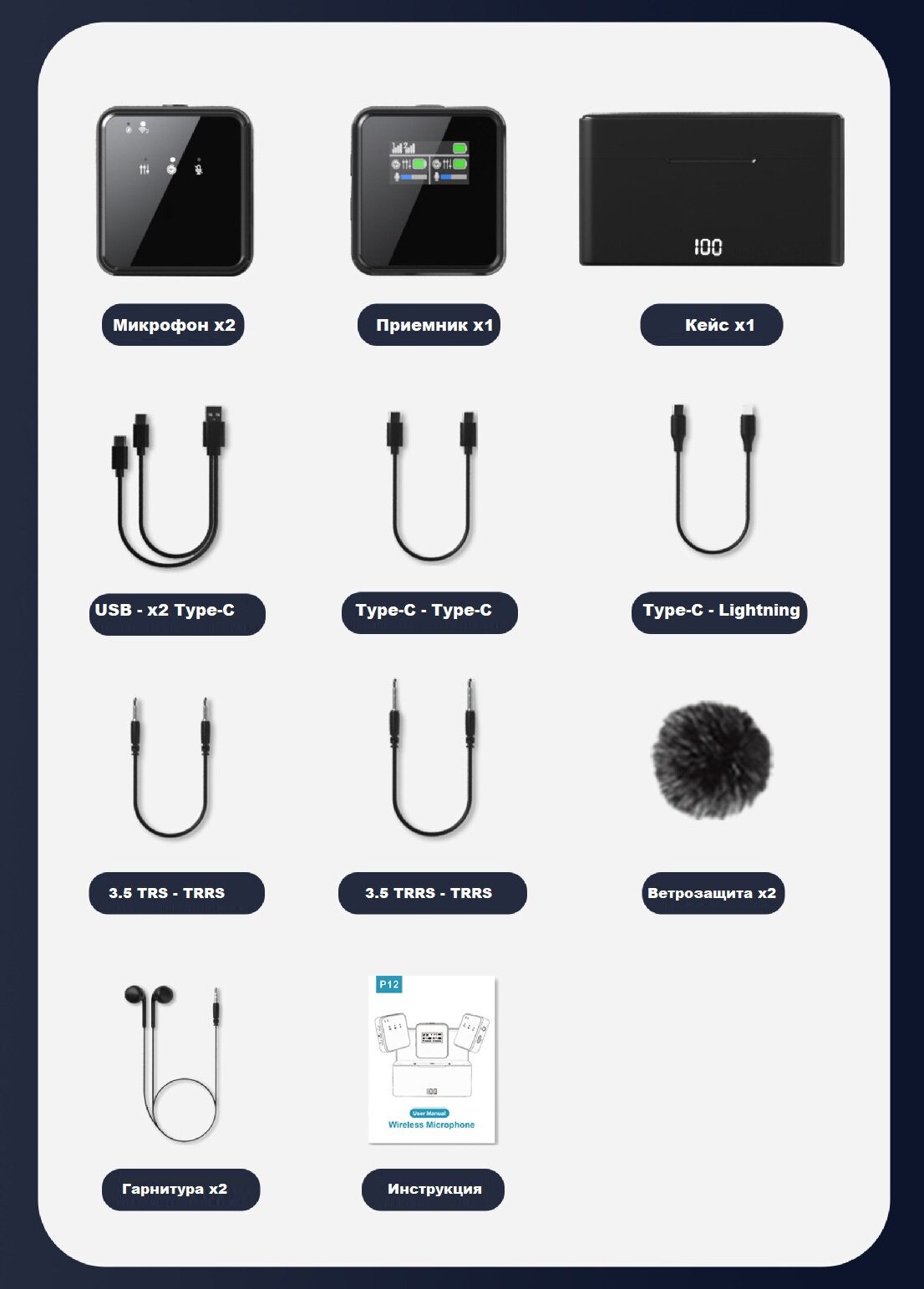 | Подробная комплектация | Кейс зарядки, 2 микрофона, 1 приемник, Кабель USB - 2 Type-C, Кабель 3.5 TRRS - 3.5мм TRS, Кабель 3.5 TRRS - 3.5мм TRRS,Кабель Type-C - Type-C, Кабель Type-C - Lightning, Проводная гарнитура x2, Ветрозащита х2, Инструкция(на английском) |