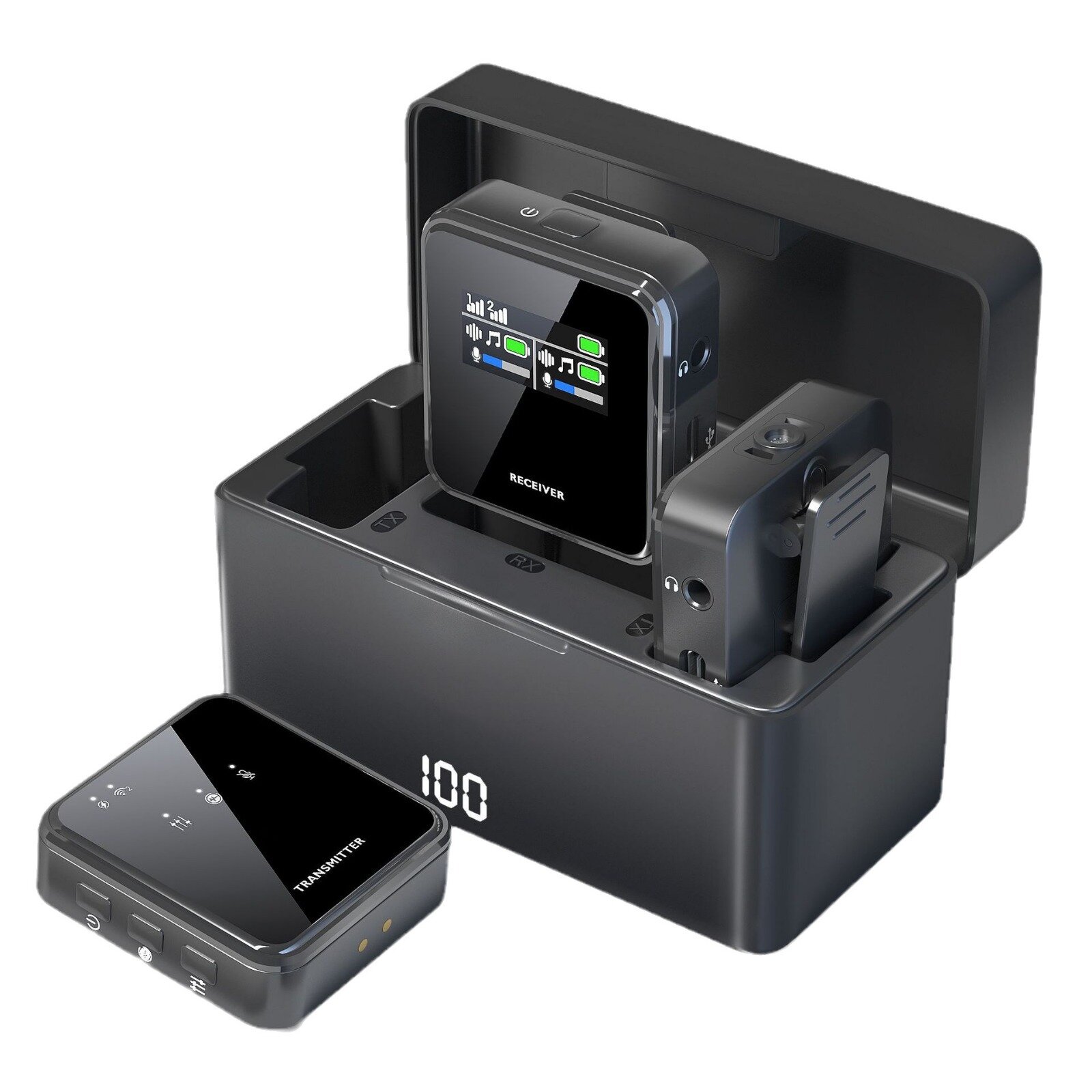 10 цен на Беспроводная петличная радиосистема универсальная c Bluetooth P12. Кейс для зарядки, 2 микрофона, приемник.
