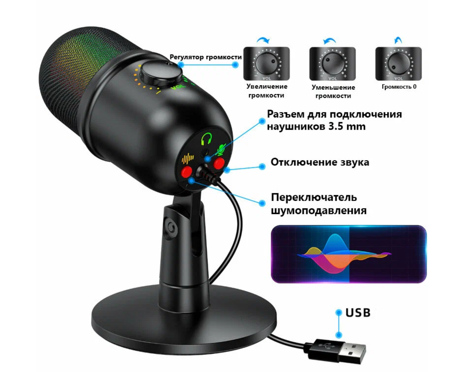 Многофункциональный микрофон игровой для стриминга из прочного алюминия с ргб подсветкой и поп фильтром для компьютера информация: