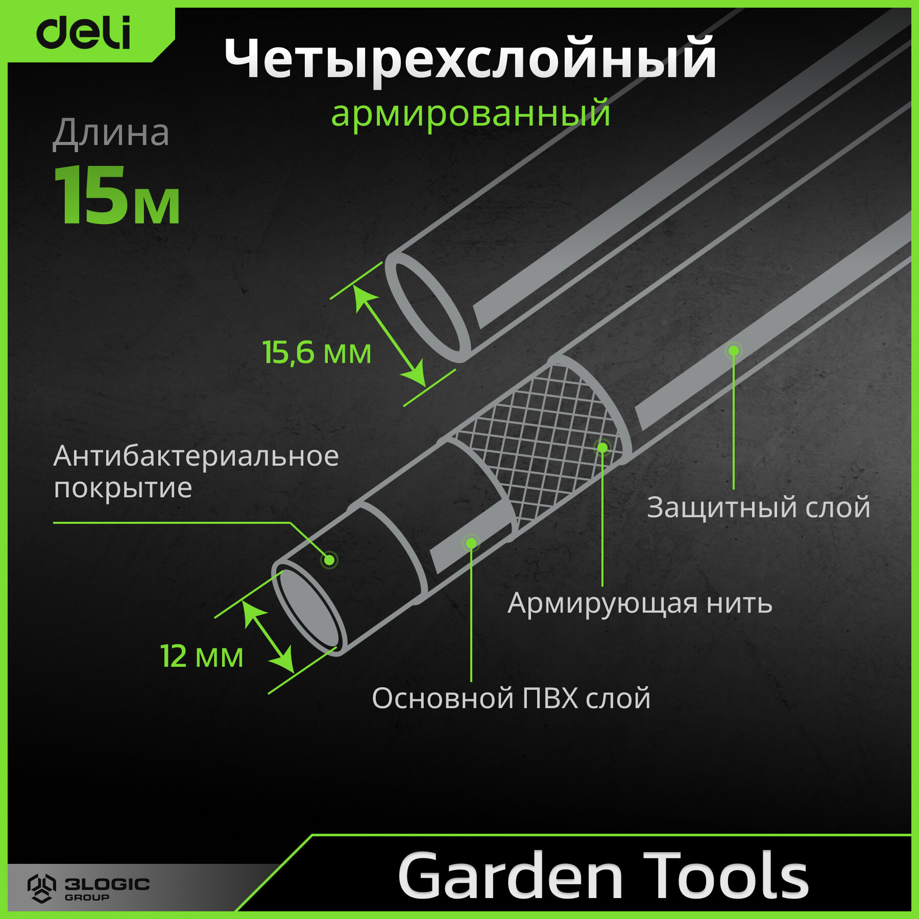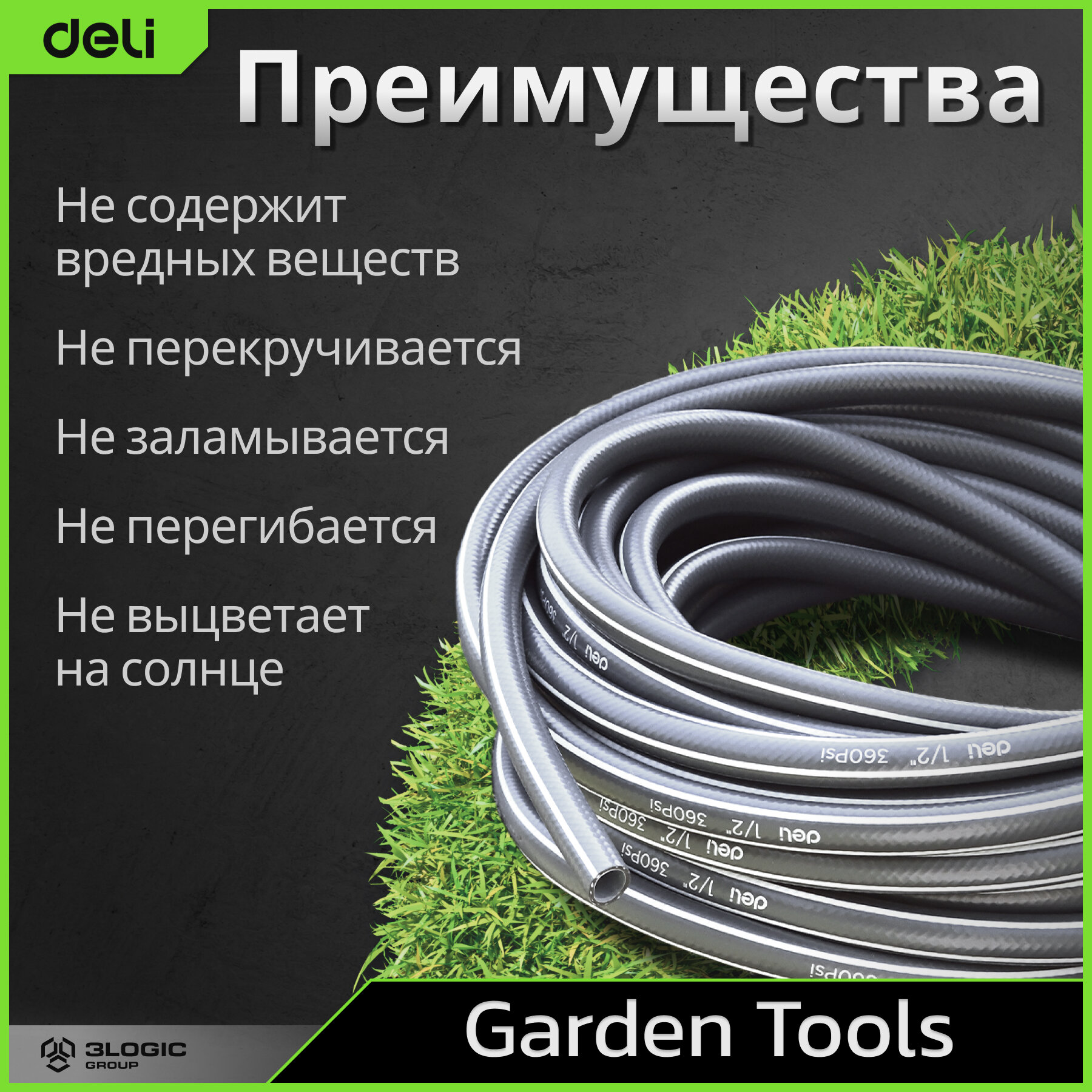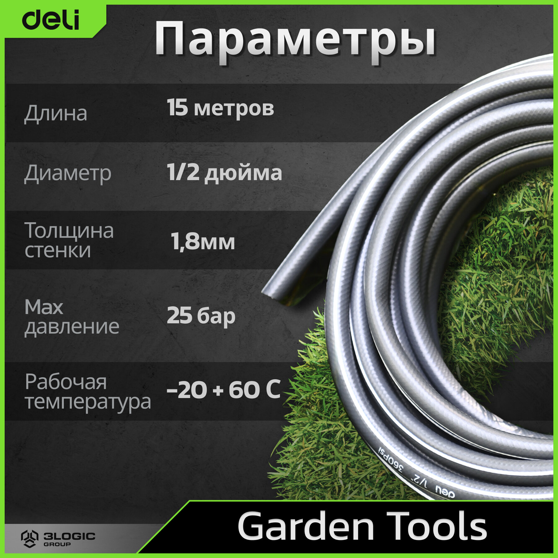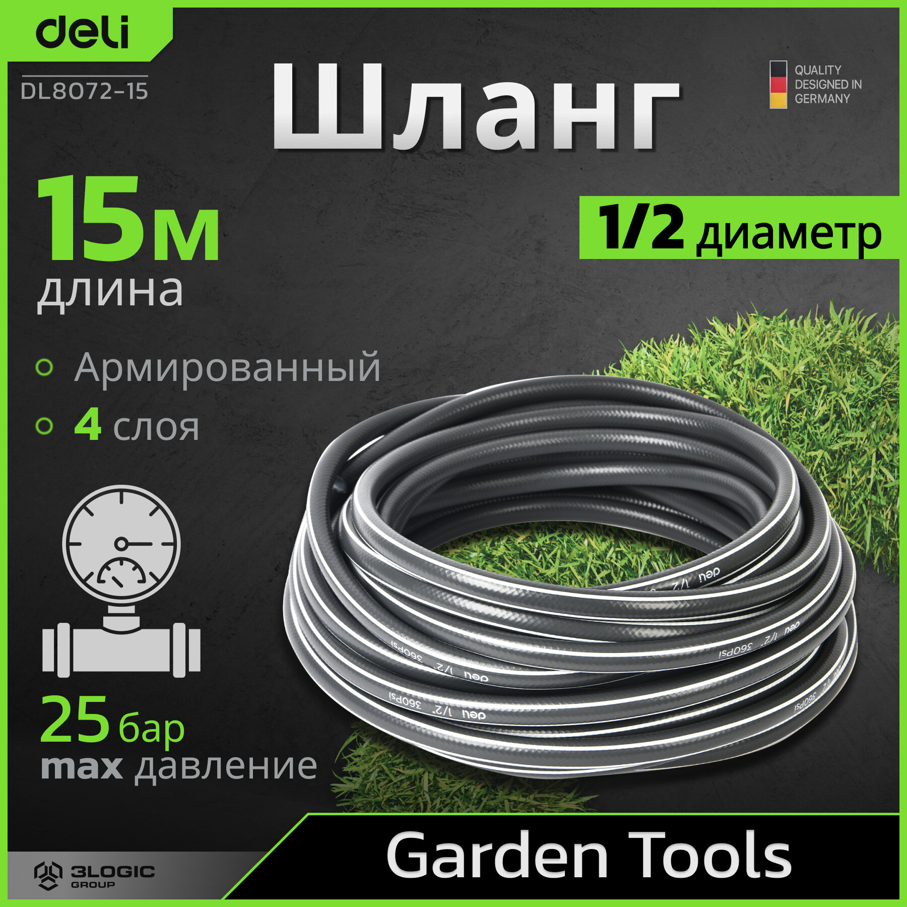 10 цен на Шланг поливочный армированный Deli DL8072-15 15 метров, 1/2", 4 слоя, давление до 25 бар, серый DL80 .