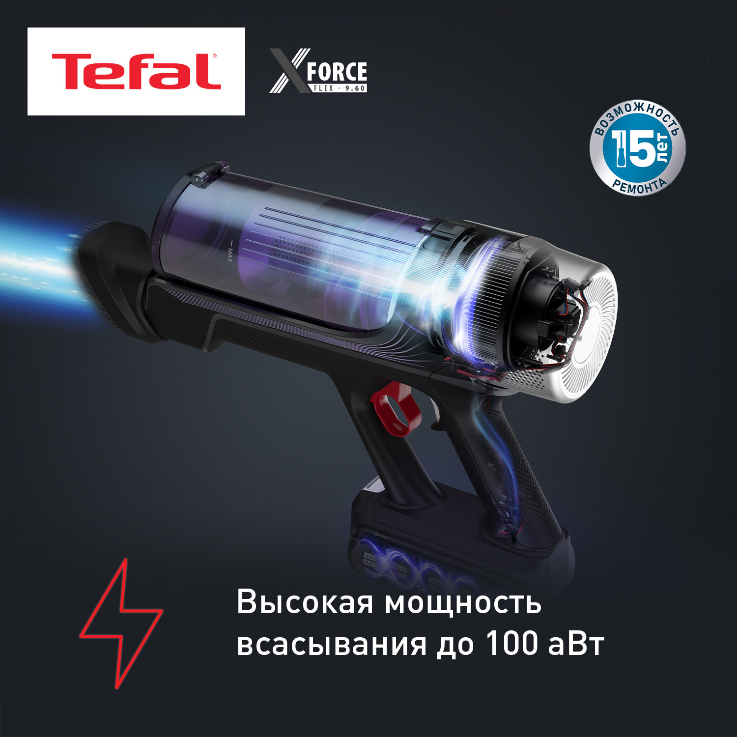 Беспроводной пылесос Tefal X-Force Flex 9.60 Aqua TY20C7WO с автоматической регулировкой мощности, с насадкой для влажной уборки, черный/синий 31 999 ₽