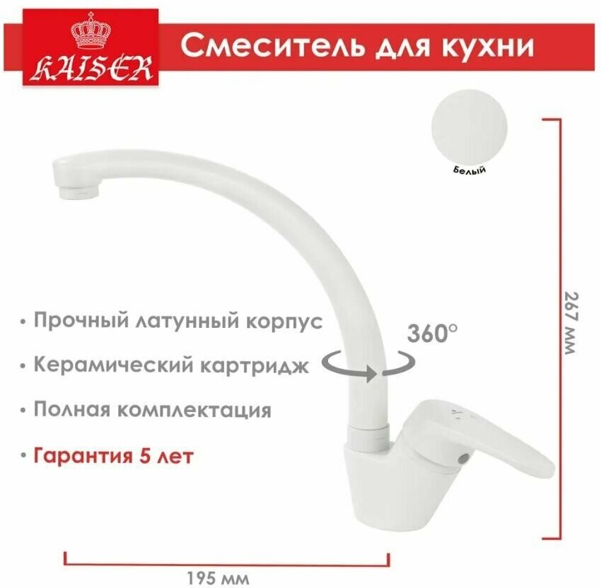 10 цен на Смеситель для кухни KAISER County, 55244-4, с поворотным изливом / белый / Германия, Гарантия 5 лет