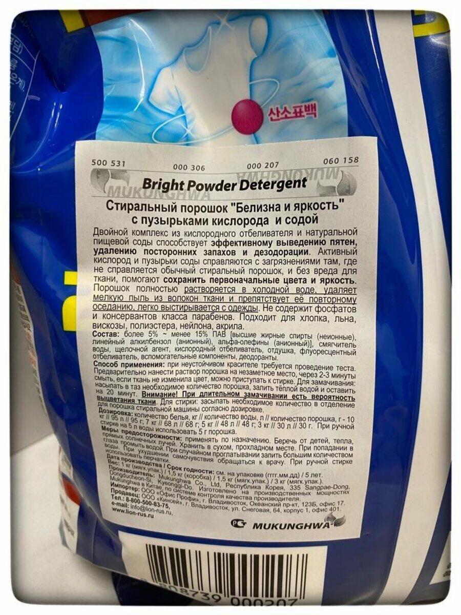Стиральный порошок MUKUNGHWA Белизна и яркость с кислородом и содой, 3 кг