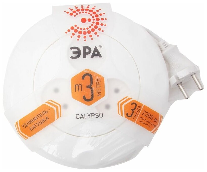 ЭРА Б0019038 Удлинитель-рулетка UR-3-3m-W Calypso без заземления белый 3 гнезда 3 м полипропилен, 2 .