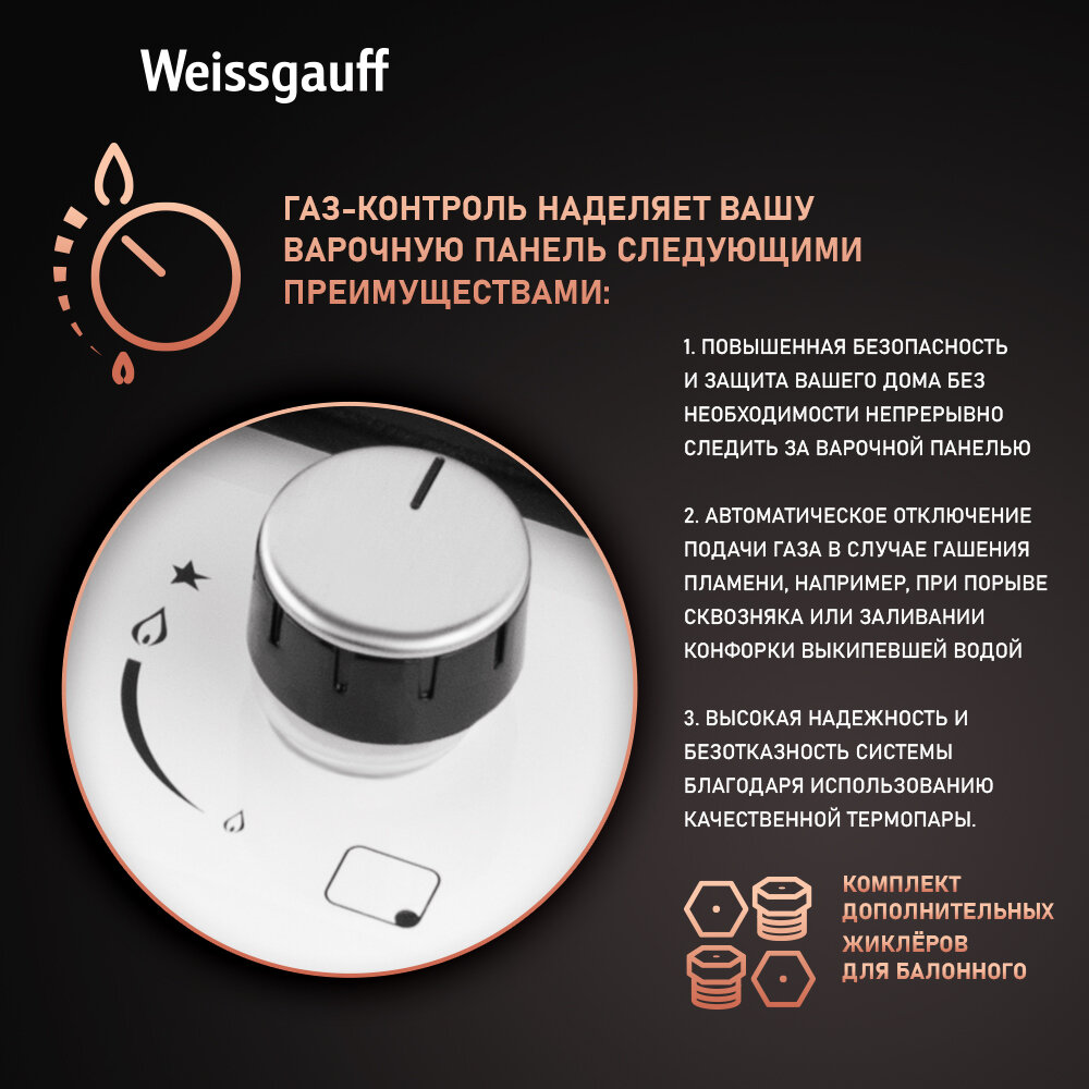 Варочная панель Weissgauff HGG 641 WGH WOK-конфорка, 3 года гарантии, автоматический электроподжиг, Рукоятки Hi-Tech, газ-контроль информация: