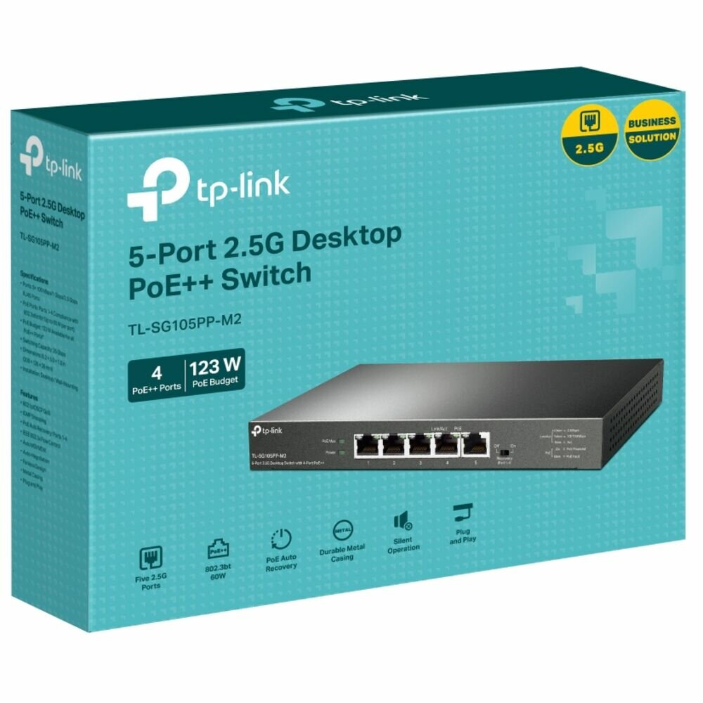 TP-Link TL-SG105PP-M2, Настольный коммутатор с 5 портами 2,5 Гбит/с (4 порта PoE++), 802.3af/at/bt 3-го типа, бюджет PoE — 123 Вт, стальной настольный 17 155 ₽