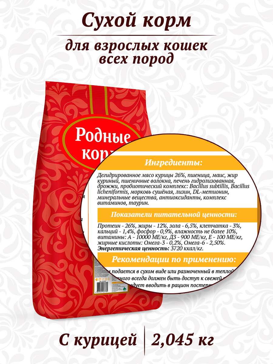 Корм для кошек сухой Родные Корма для взрослых животных всех пород, гранулы с курицей 2.045кг / кошачья еда 1 195 ₽