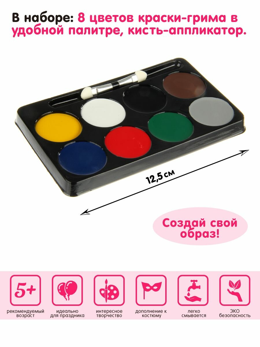 Грим театральный для лица и тела, палитра 8 цветов, Фабрика Фантазий / Аквагрим для детей, набор краски для грима с кистью-аппликатором / Halloween, хэлоуин информация: