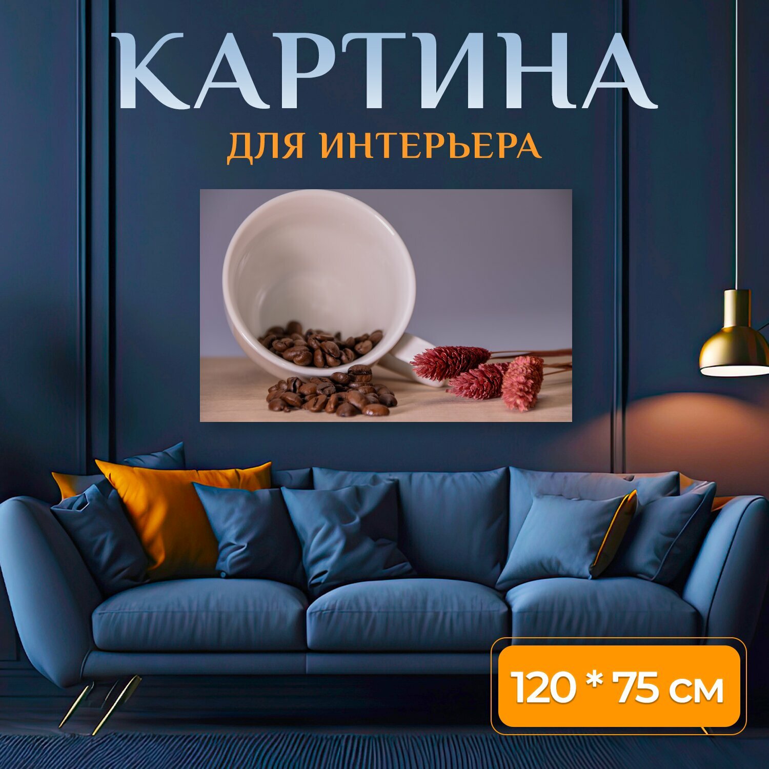 Картина на холсте "Чашка, кофейные зерна, кофе" на подрамнике 120х75 см. для интерьера информация: