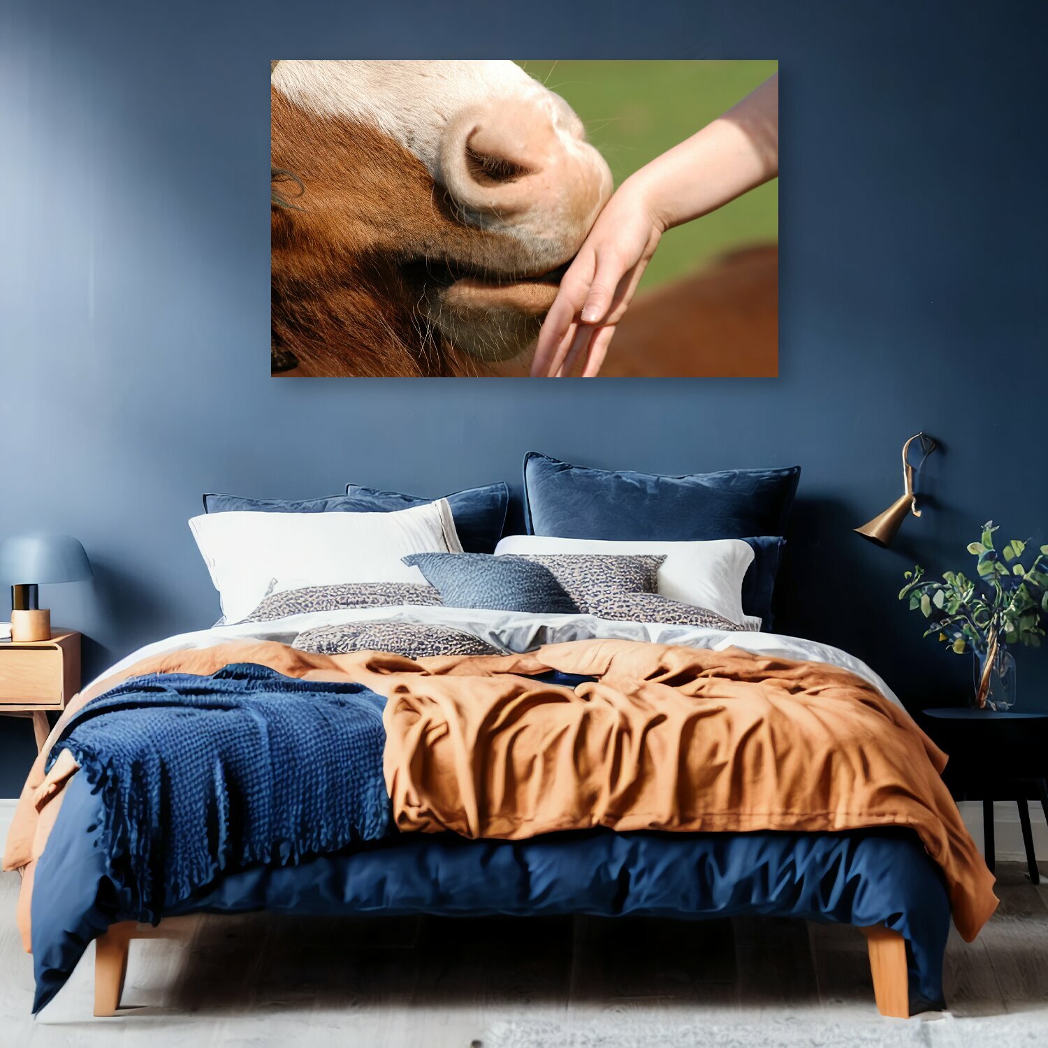 10 цен на Картина на холсте "Лошадь, рука, поцелуй руки" на подрамнике 120х75 см. для интерьера