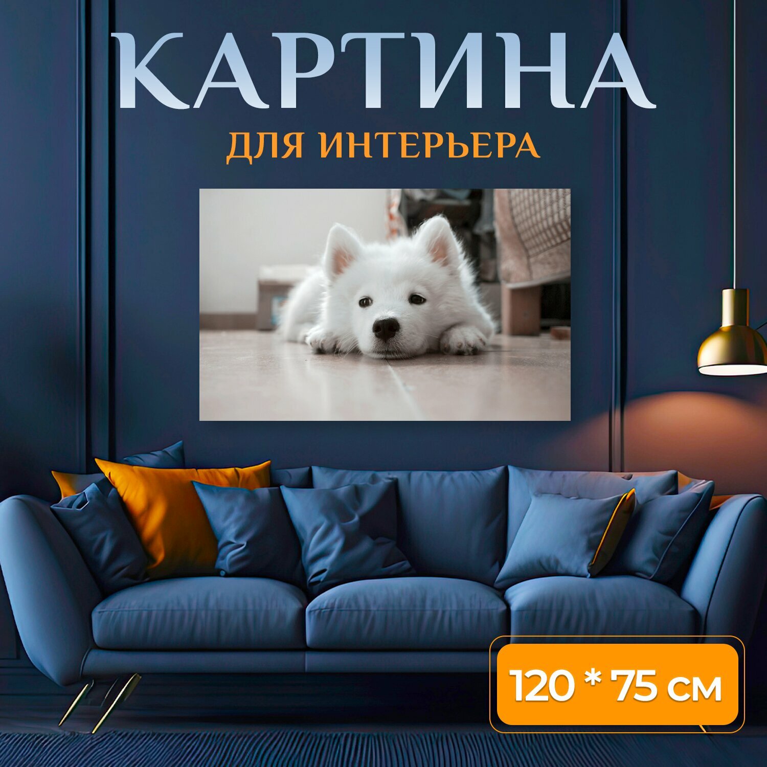 Картина на холсте "Собака, щенок, белый" на подрамнике 120х75 см. для интерьера информация: