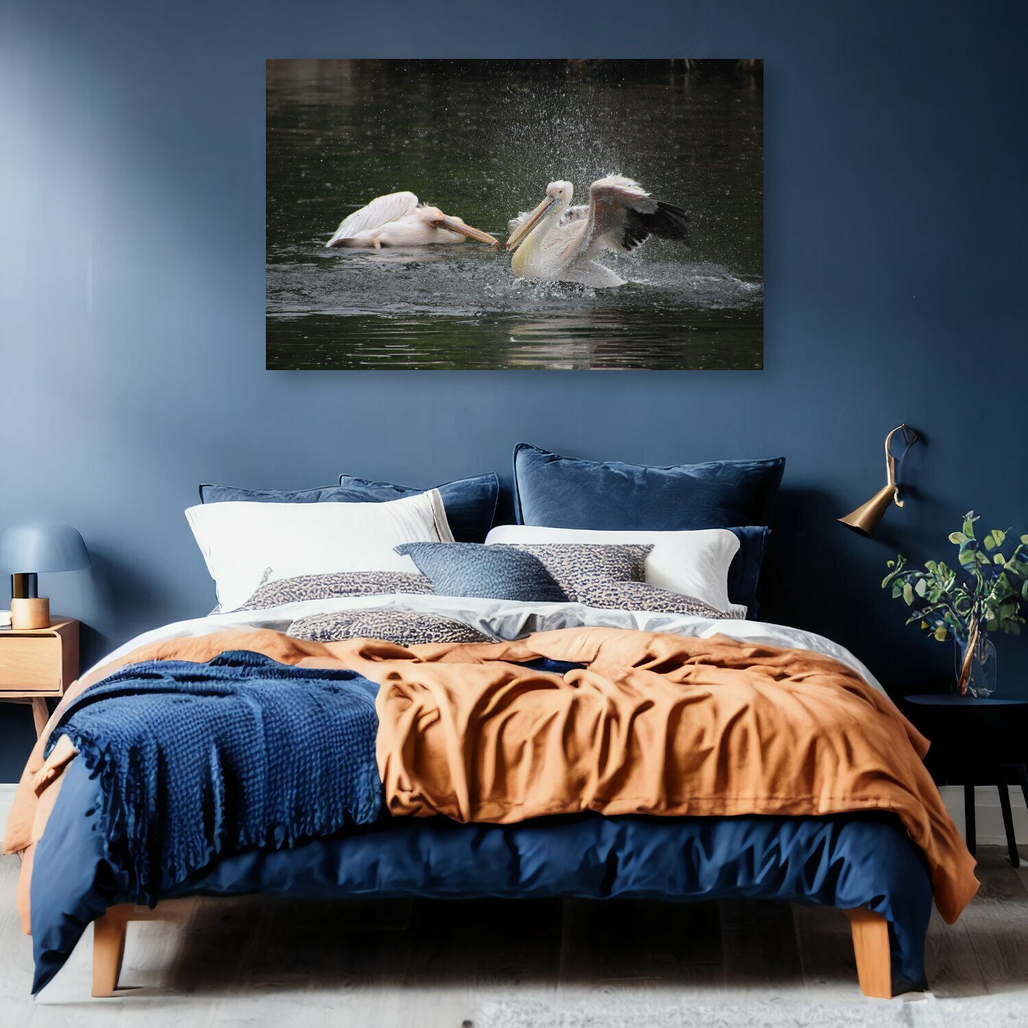 10 цен на Картина на холсте "Пеликаны, птицы, озеро" на подрамнике 120х75 см. для интерьера