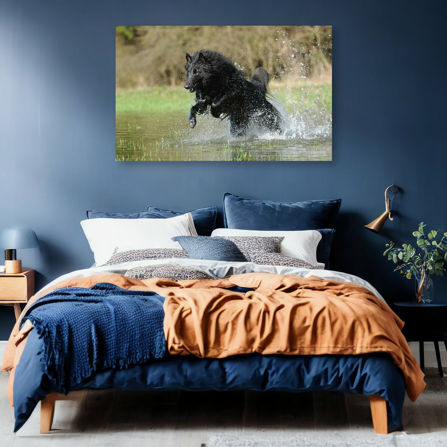 10 цен на Картина на холсте "Бельгийская овчарка, вода, собака" на подрамнике 120х75 см. для интерьера