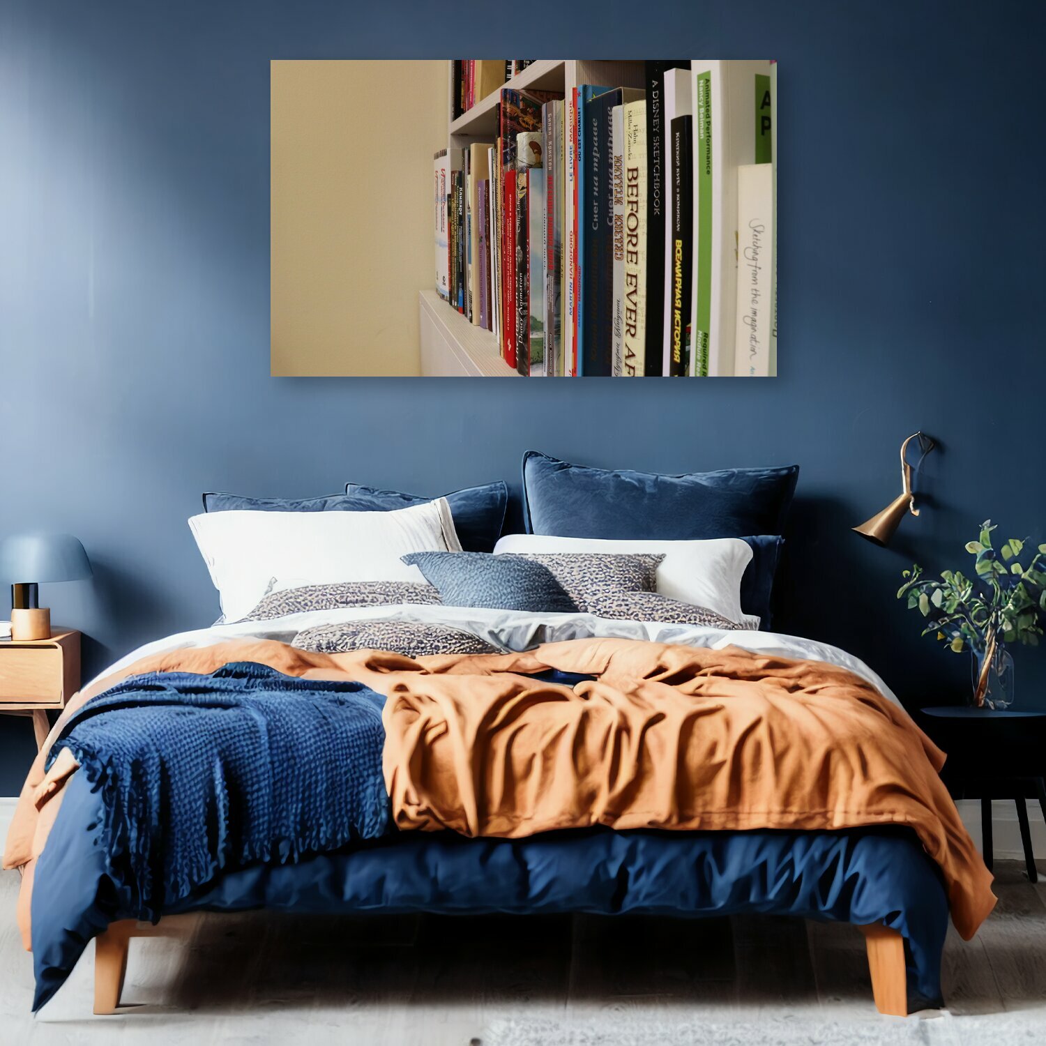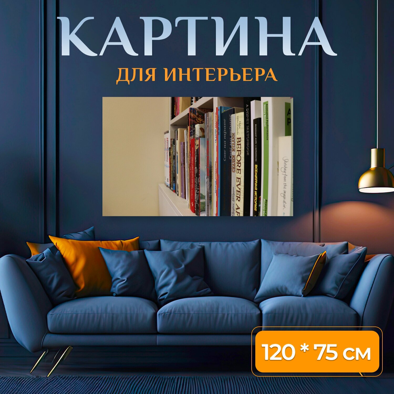 10 цен на Картина на холсте "Книги, полка, чтение" на подрамнике 120х75 см. для интерьера