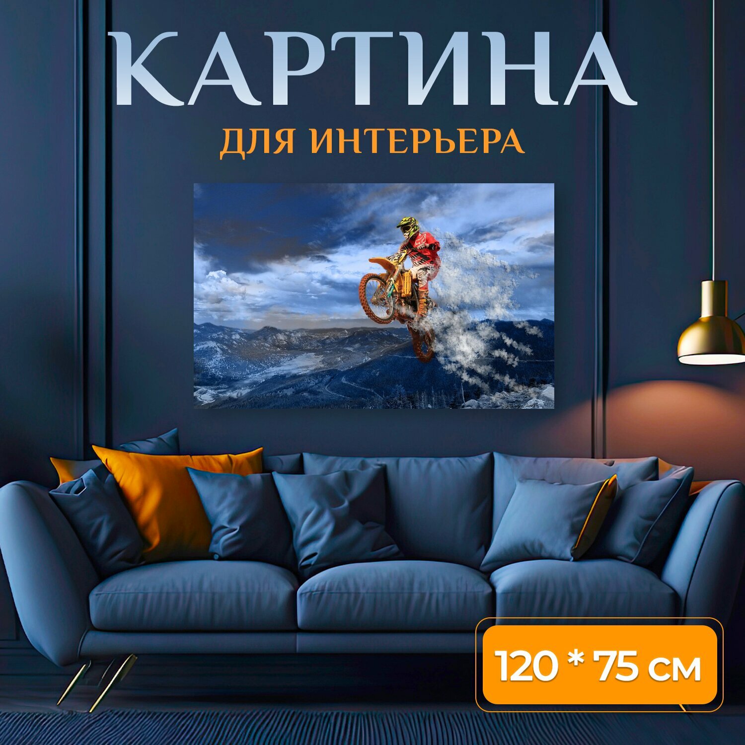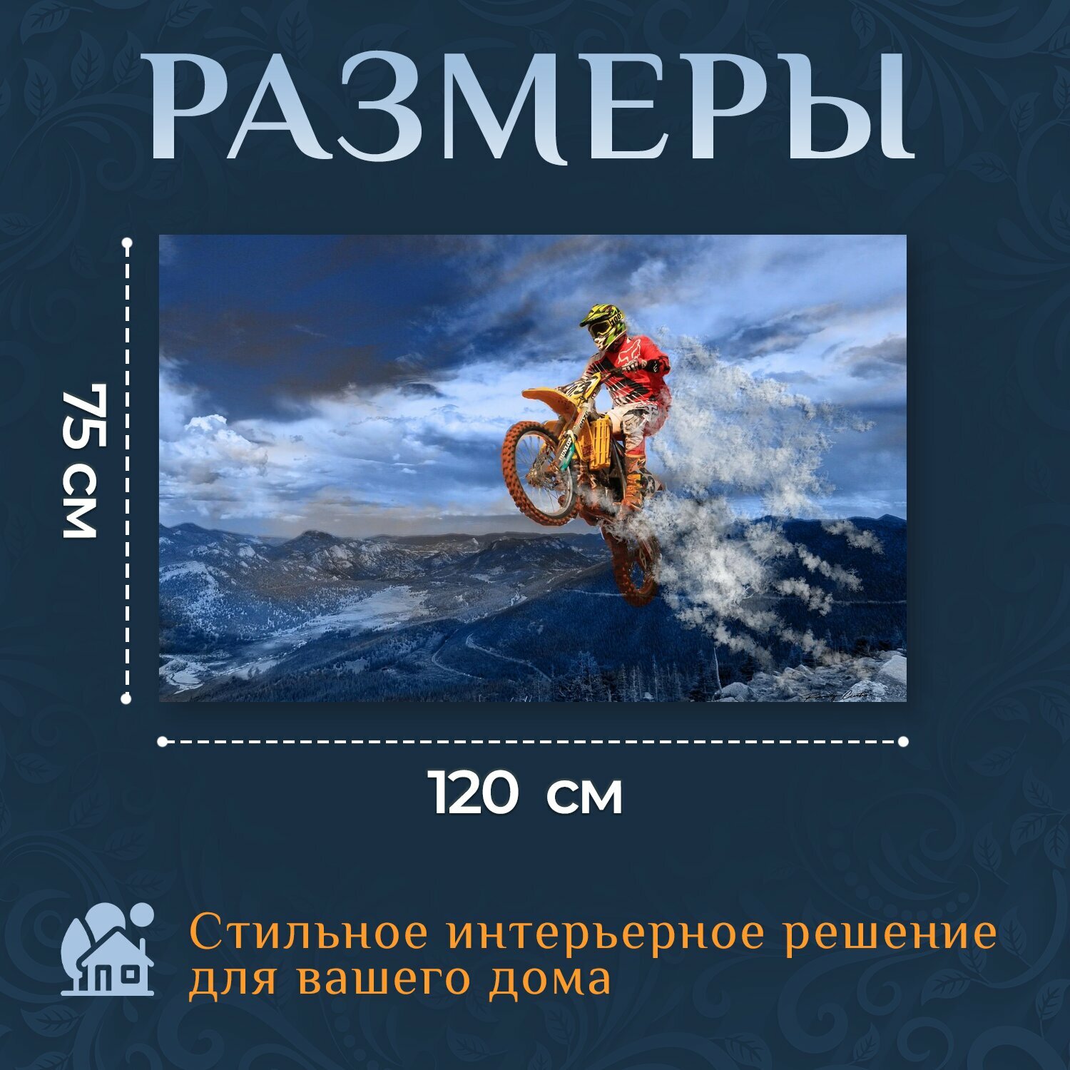 Картина на холсте "Мотоцикл, прыгать, действие" на подрамнике 120х75 см. для интерьера информация: