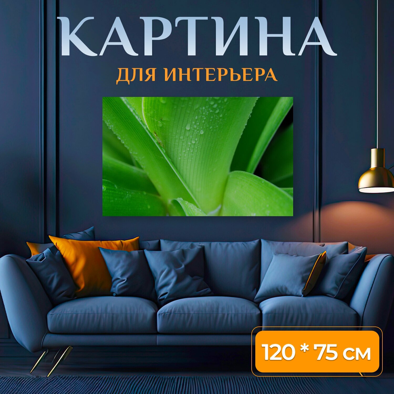 10 цен на Картина на холсте "Листья, зеленый, капля воды" на подрамнике 120х75 см. для интерьера