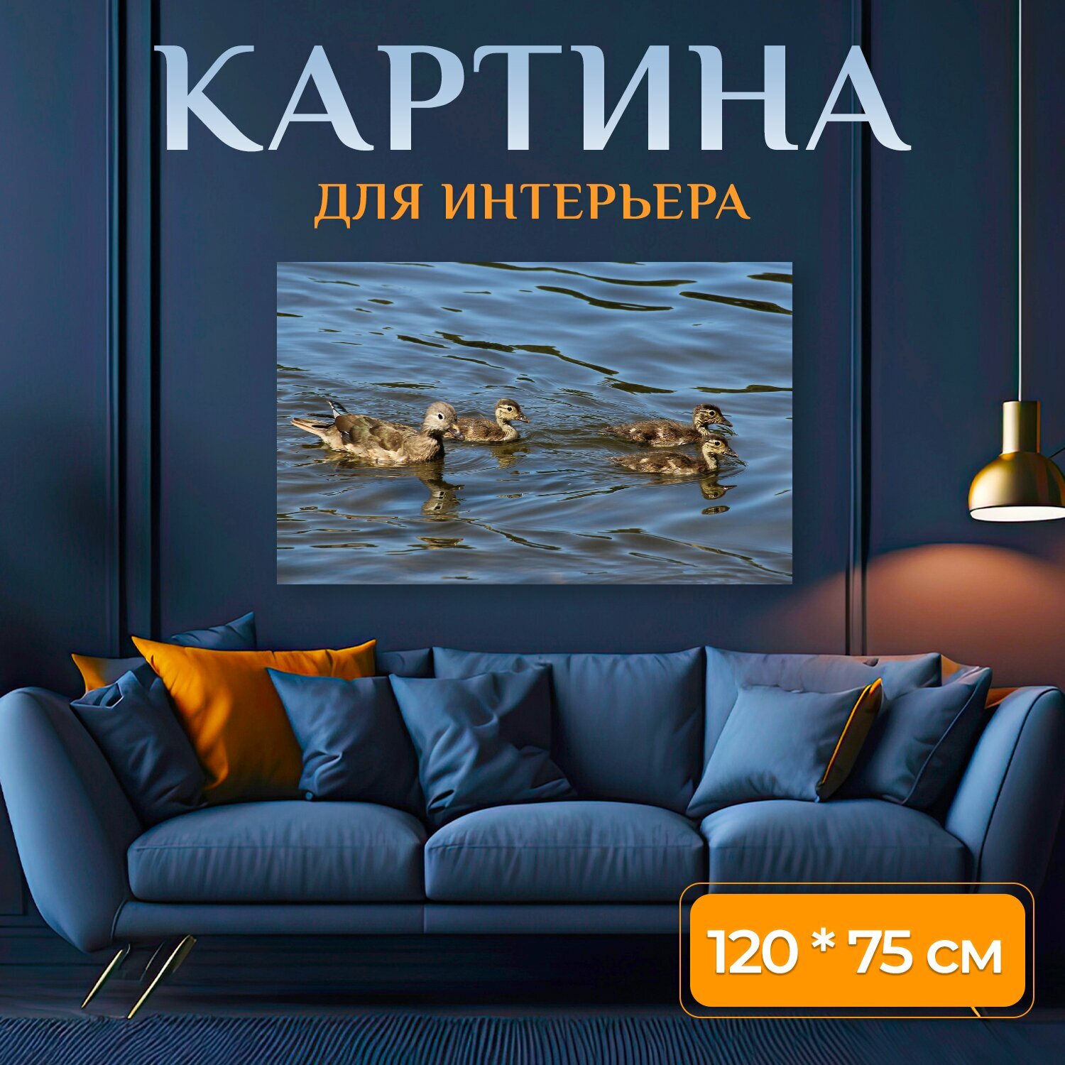 10 цен на Картина на холсте "Утка, цыпленок, озеро" на подрамнике 120х75 см. для интерьера