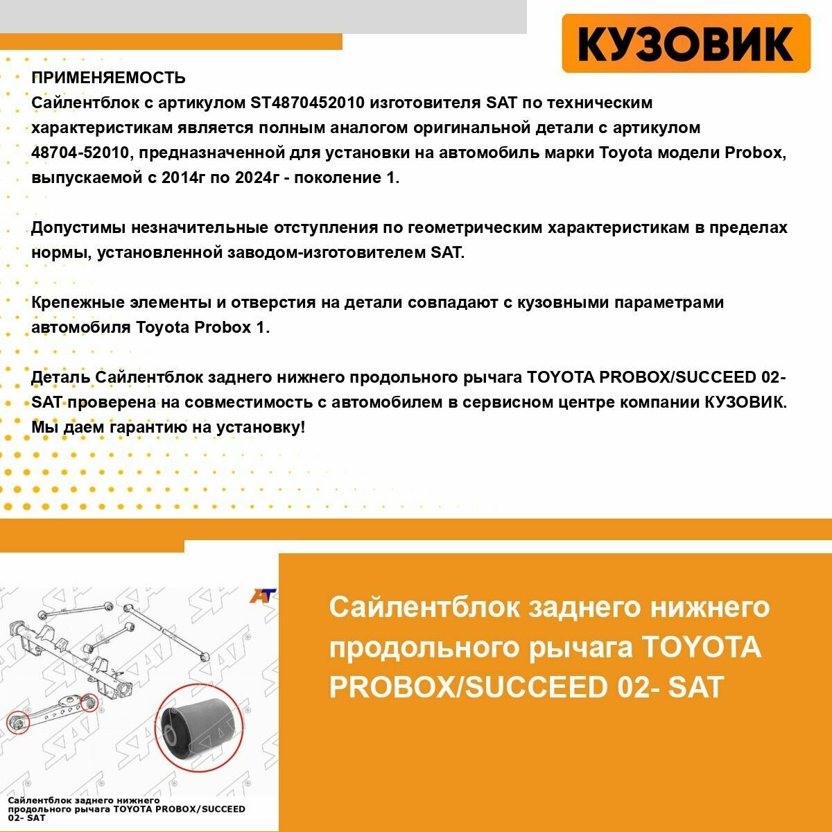 Отзывы на Сайлентблок заднего нижнего продольного рычага TOYOTA PROBOX/SUCCEED 02- SAT тойота Probox