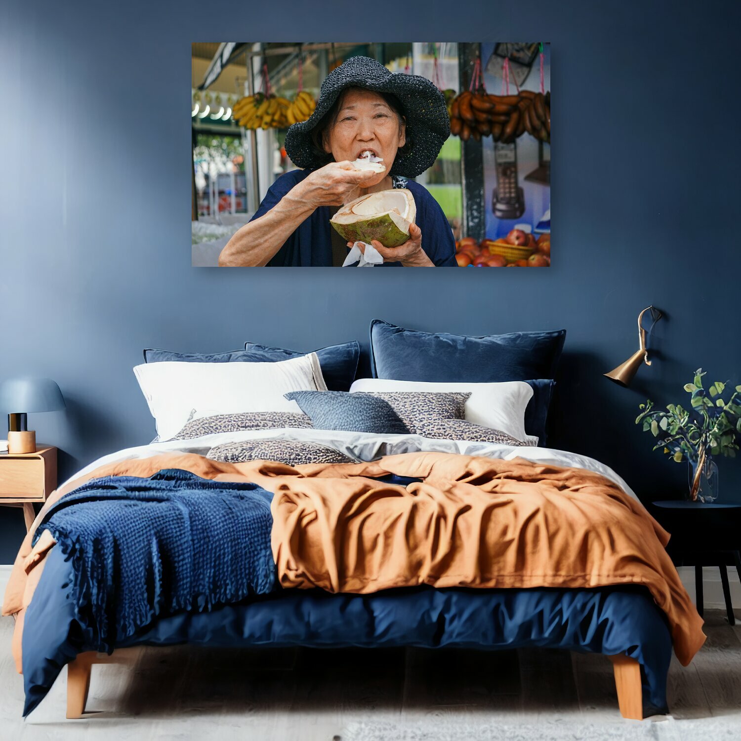 10 цен на Картина на холсте "Женщина, принимать пищу, шапка" на подрамнике 120х75 см. для интерьера