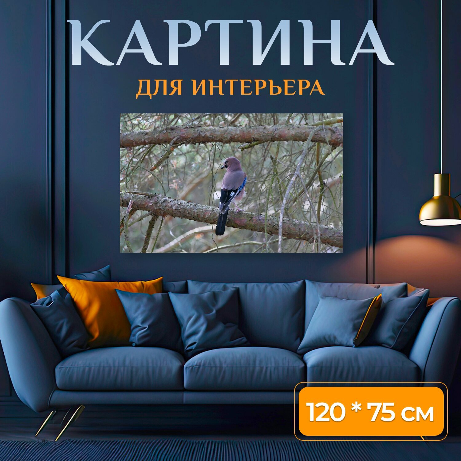 10 цен на Картина на холсте "Обыкновенная сойка, птица, ветви" на подрамнике 120х75 см. для интерьера