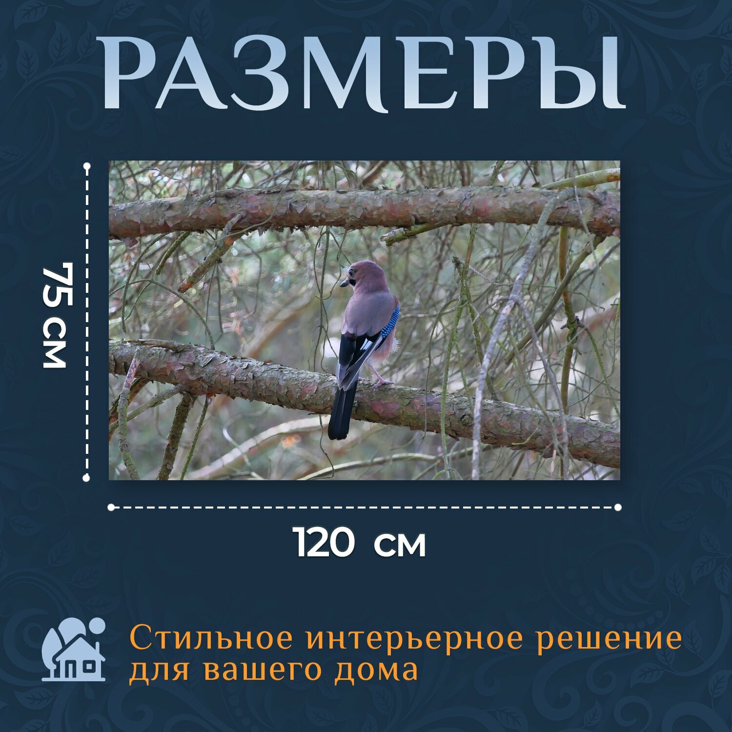 Картина на холсте "Обыкновенная сойка, птица, ветви" на подрамнике 120х75 см. для интерьера информация:
