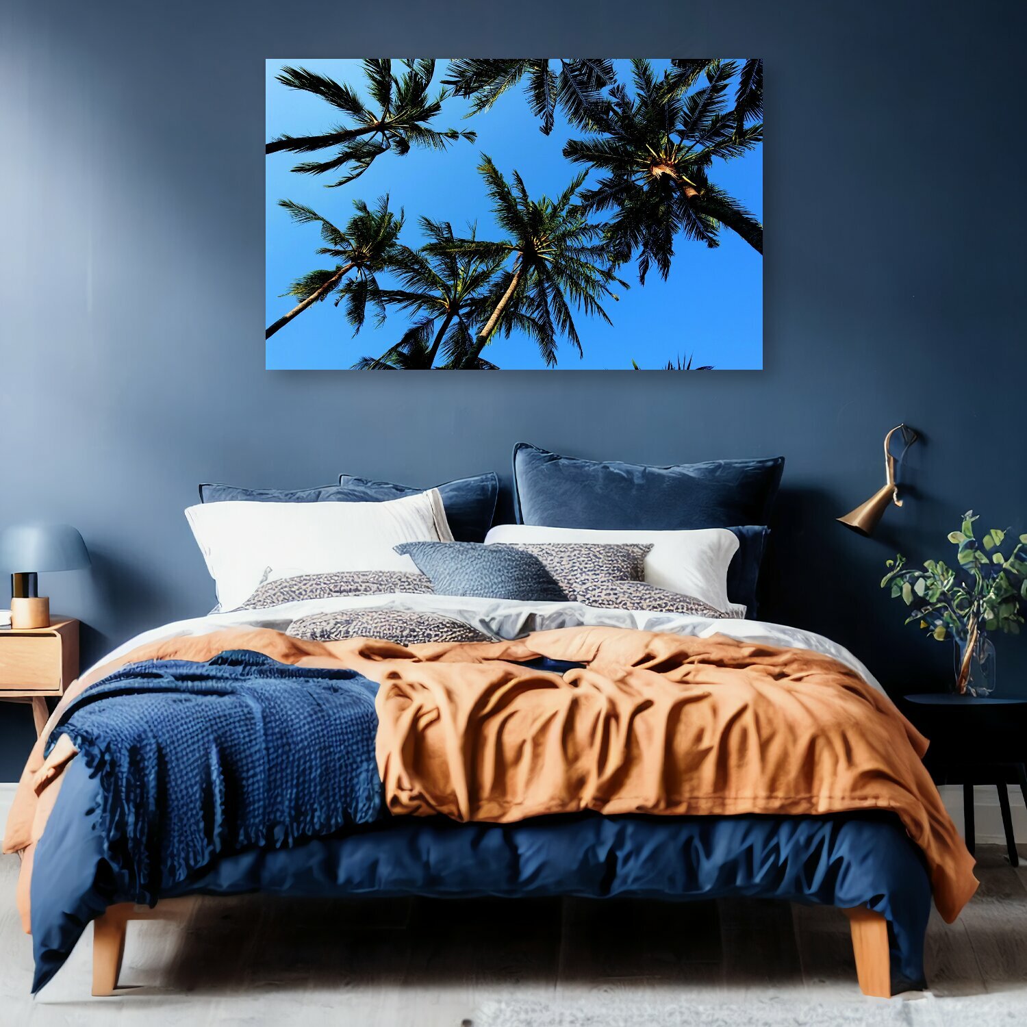 10 цен на Картина на холсте "Пальмовые деревья, небо, синий" на подрамнике 120х75 см. для интерьера