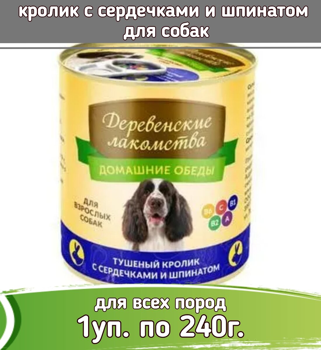 Корм для собак деревенские лакомства Домашние обеды Тушеный кролик, сердечки, шпинат конс. 240г (упаковка - 4 шт)