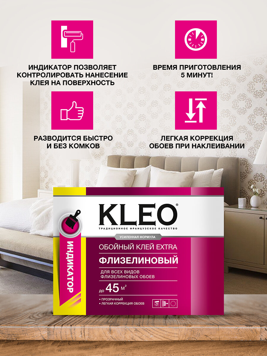 Клей для обоев KLEO EXTRA INDICATOR 45 усиленная формула с индикатором,обойный клей для виниловых, флизелиновых, бумажных, для обоев на основе малярного флизелина, антигрибковая и антисептическая формула Клео Экстра