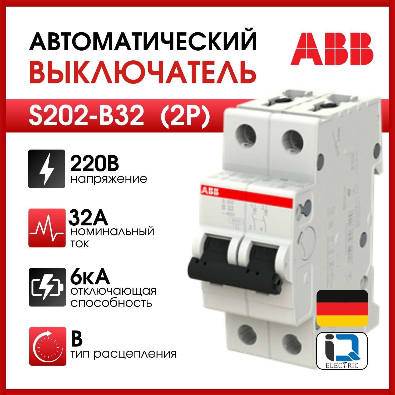 ABB Автоматический выключатель двухполюсный B 32А 6кА S202
