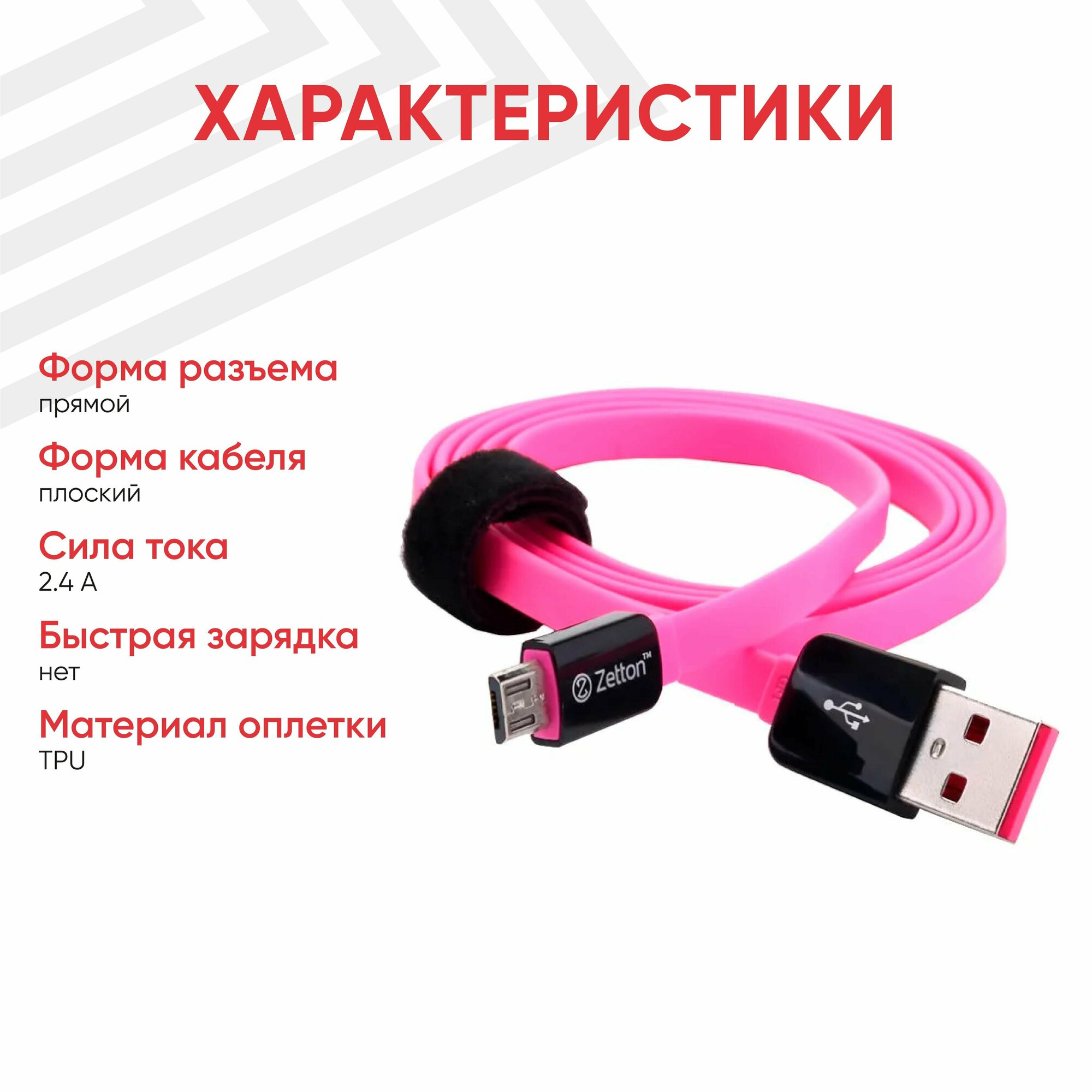 Кабель Zetton Flat, microUSB плоский, 1 м, черный с розовым информация: