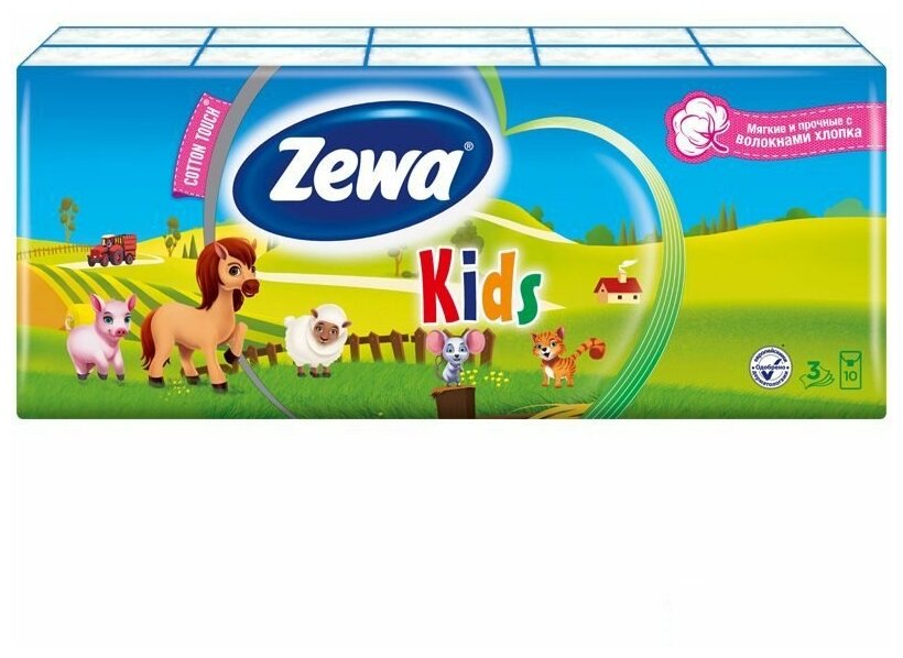 Детские Платочки Бумажные Носовые Zewa Kids, 3 слоя, 10шт. Х 10