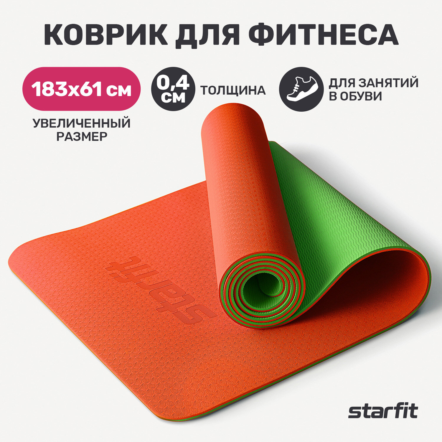 Коврик для йоги STARFIT FM-201 TPE, 183x61х0,4 см, оранжевый/зеленый