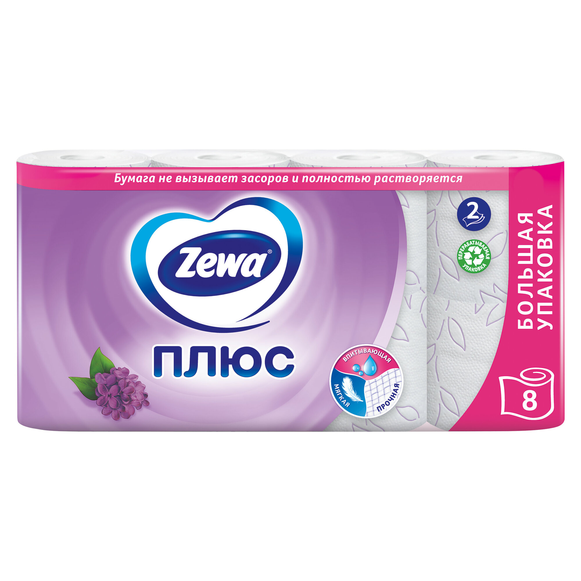 Туалетная бумага Zewa "Плюс", 2 слоя, 8 рулонов, "Сирень"