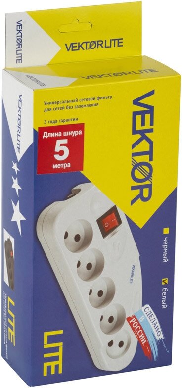 Сетевой фильтр VEKTOR Lite, 5 розеток, б/з, 10А / 2200 Вт 5 5 м 250 мм 100 мм 70 мм белый