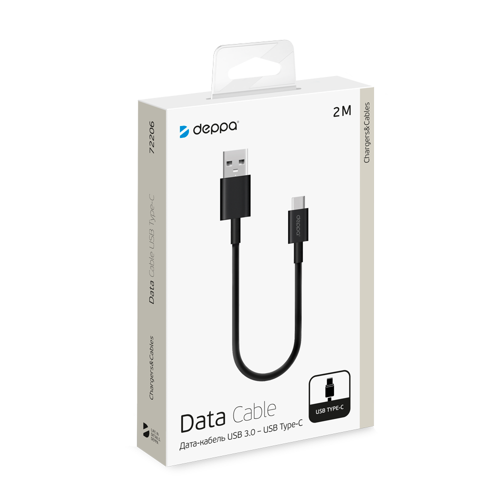 72206, Кабель Deppa USB A - USB Type-C, USB 3.0, 1.2м, черный