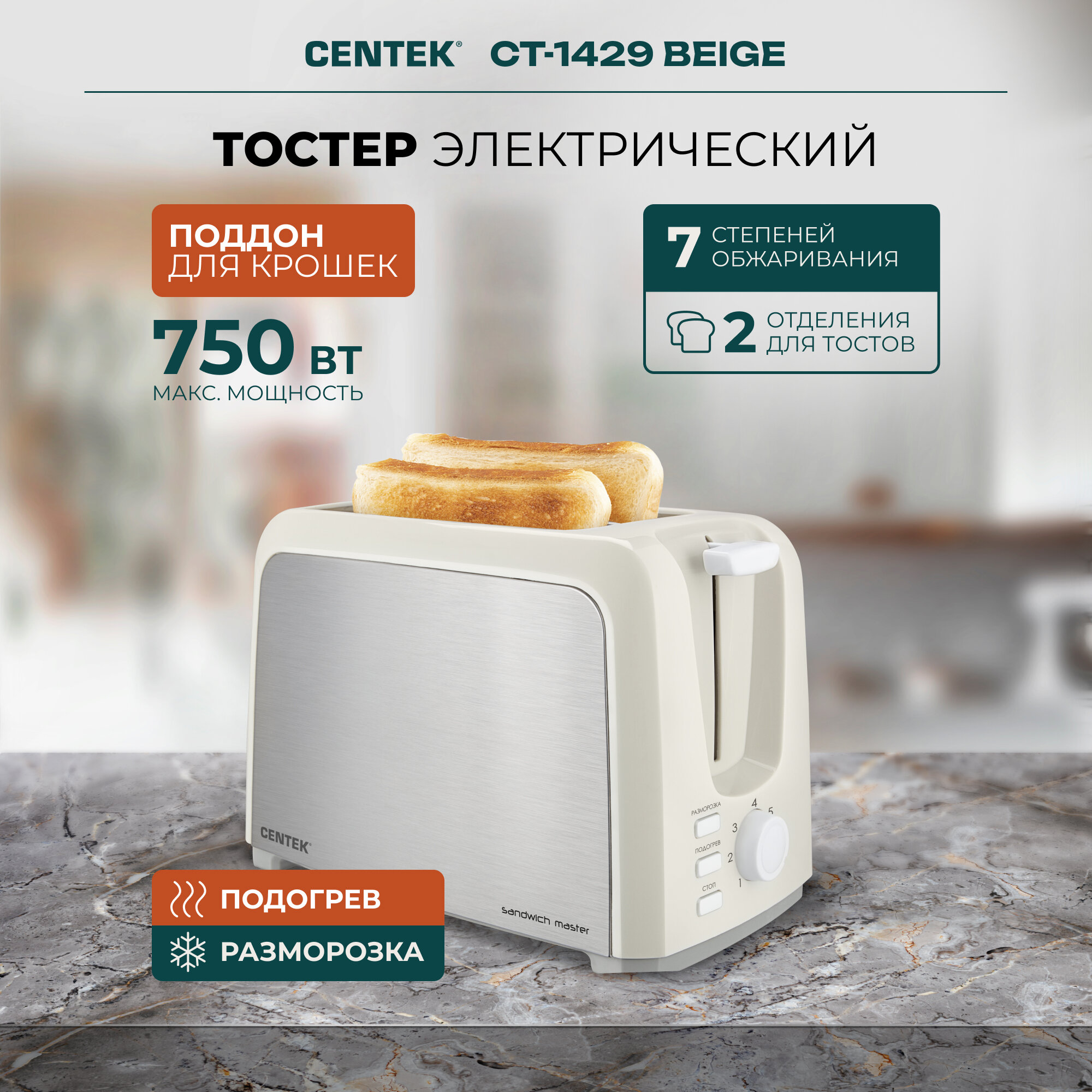 10 цен на Тостер для хлеба CENTEK СТ-1429 Beige/ 750 Вт/ 7 уровней прожарки/ 2 тоста/ поддон/ стоп/ подогрев/ разморозка