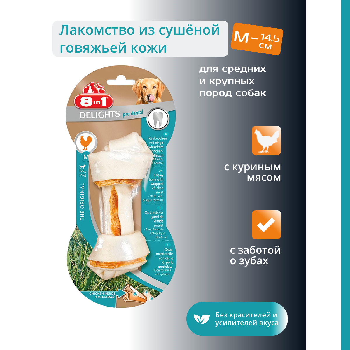 8in1 PRO DENTAL DELIGHTS M косточка с куриным мясом для собак средних и крупных пород, с добавлением минералов, 14.5 см информация: