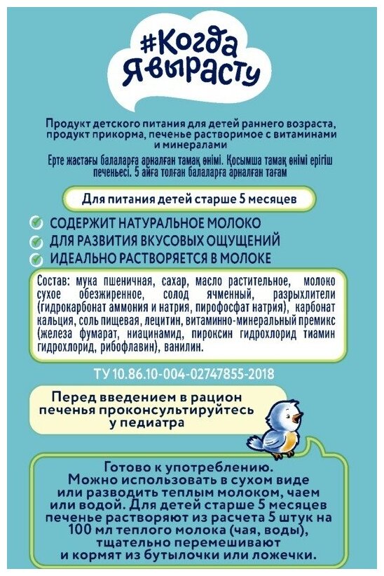 Когда Я вырасту Печенье детское растворимое, Злаковое с витаминами и с кальцием с 5 мес, 270 гр 6шт