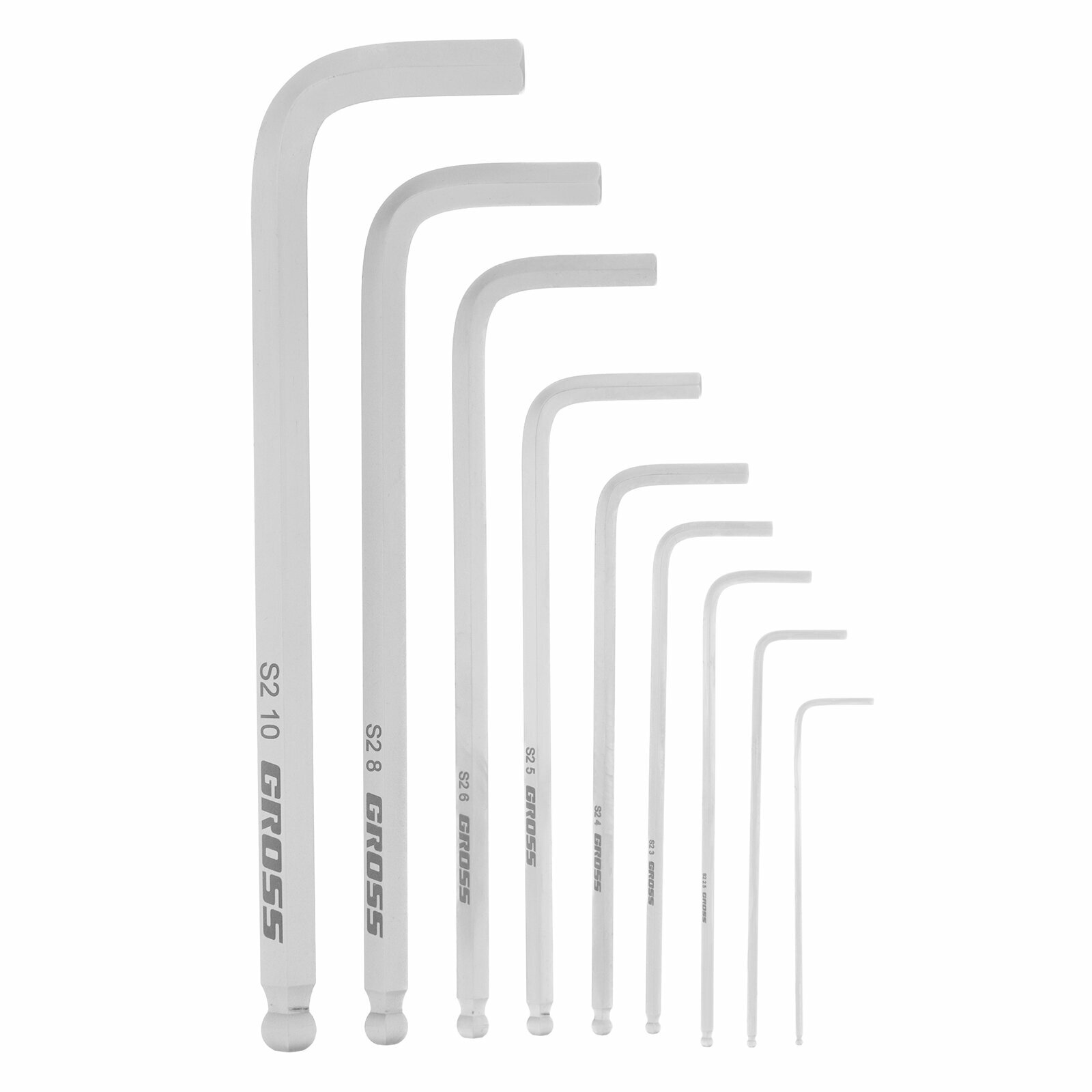 Набор ключей имбусовых HEX, 1,5–10 мм, S2, 9 шт., удлиненные с шаром, сатинированные// Gross