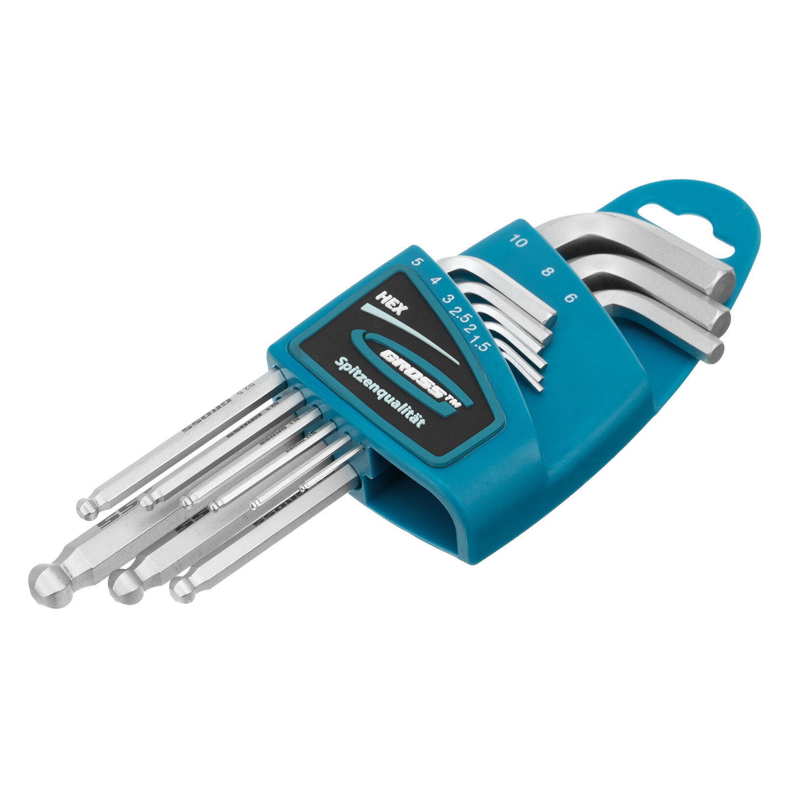 Набор ключей имбусовых HEX, 1,5–10 мм, S2, 9 штук, удлиненные с шаром, сатинированные Gross [16403]