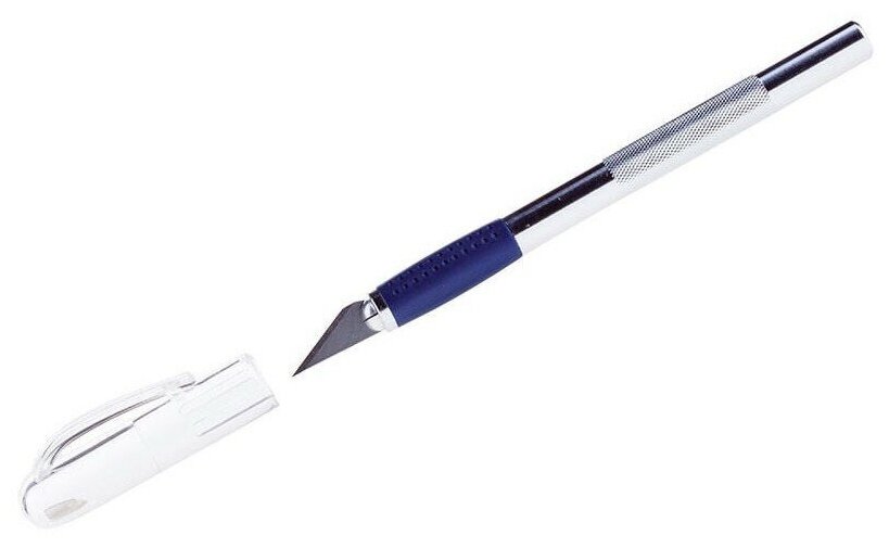 Нож канцелярский «Скальпель», полностью металлический корпус с резиновой зоной захвата и защитным колпачком, два запасных лезвия, блистер