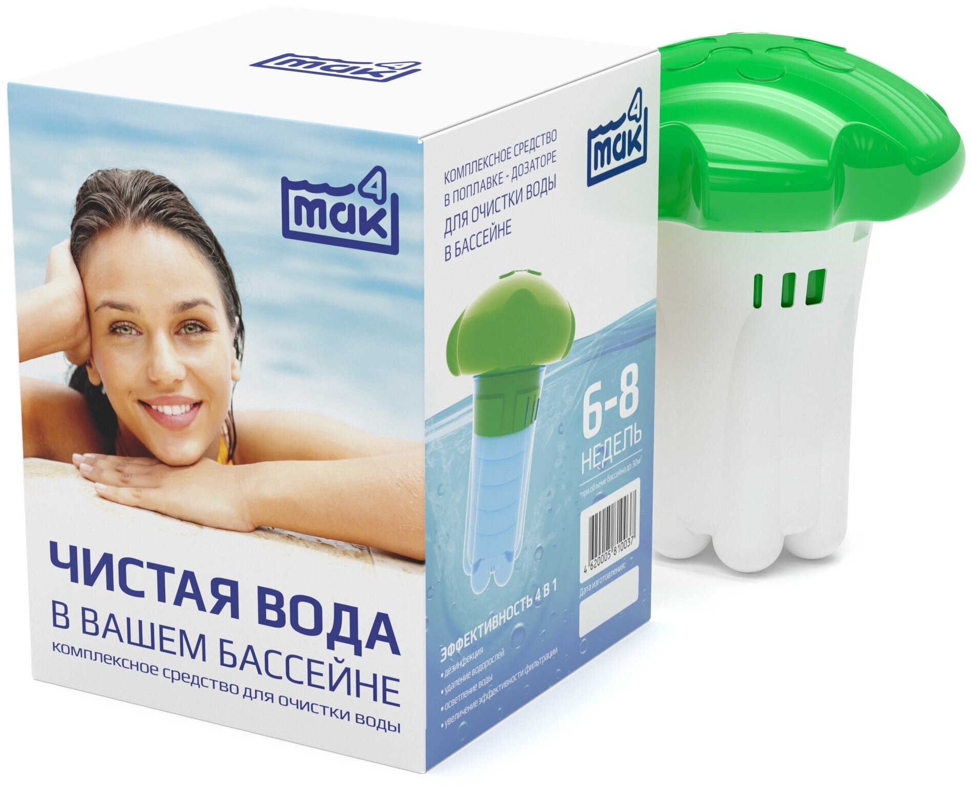 Комплексный препарат Мак 4. Четыре-в-одном в плавающем поплавке дозаторе. Для длительной дезинфекции воды в бассейне.