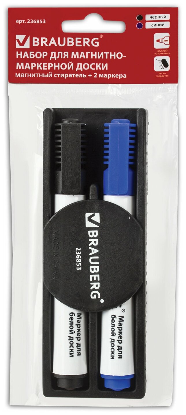 Набор для магнитно-маркерной доски (магнитный стиратель, 2 маркера 5 мм: черный, синий), BRAUBERG, 236853 (цена за 1 ед.товара)