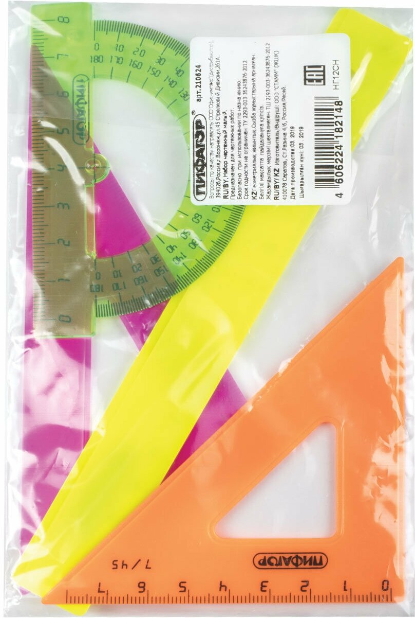 Набор чертежный малый Пифагор (линейка 16см, 2 треугольника, транспортир) непрозрачный неоновый (210624)