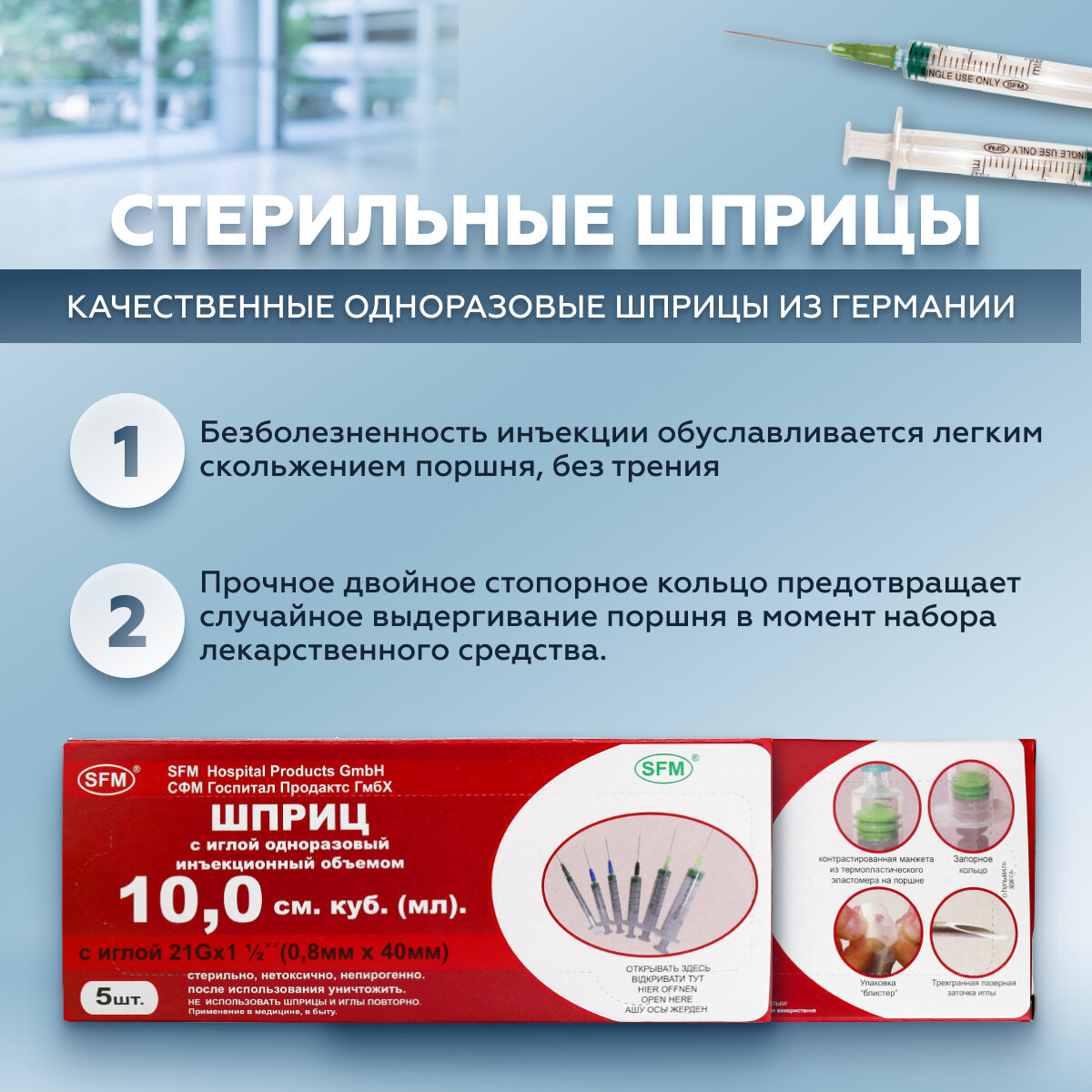 Отзывы на Шприц - 10 мл. (3-х) SFM, Германия одноразовый стерилизованный с надетой иглой 0,80 x 40 - 21G, упаковка №5 (без латекса) (блистер)