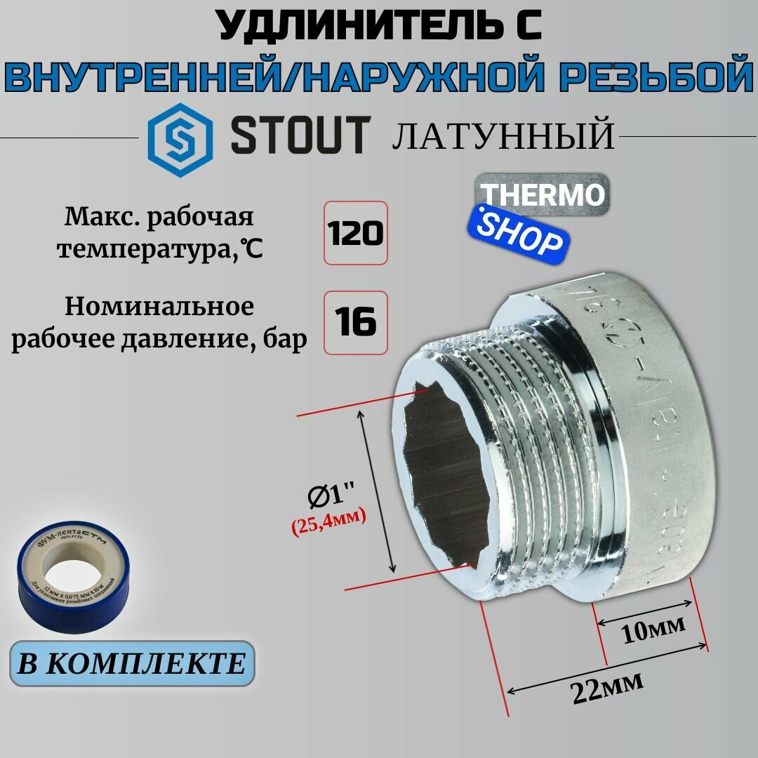 Удлинитель хромированный 1"X25 сантехнический для труб ФУМ лента 10 м