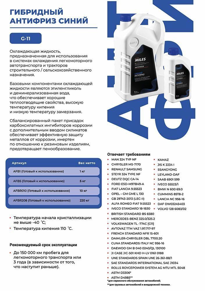 Антифриз готовый синий MILES G11, 5 литров для BMW, FORD, AUDI (AFB5) информация: