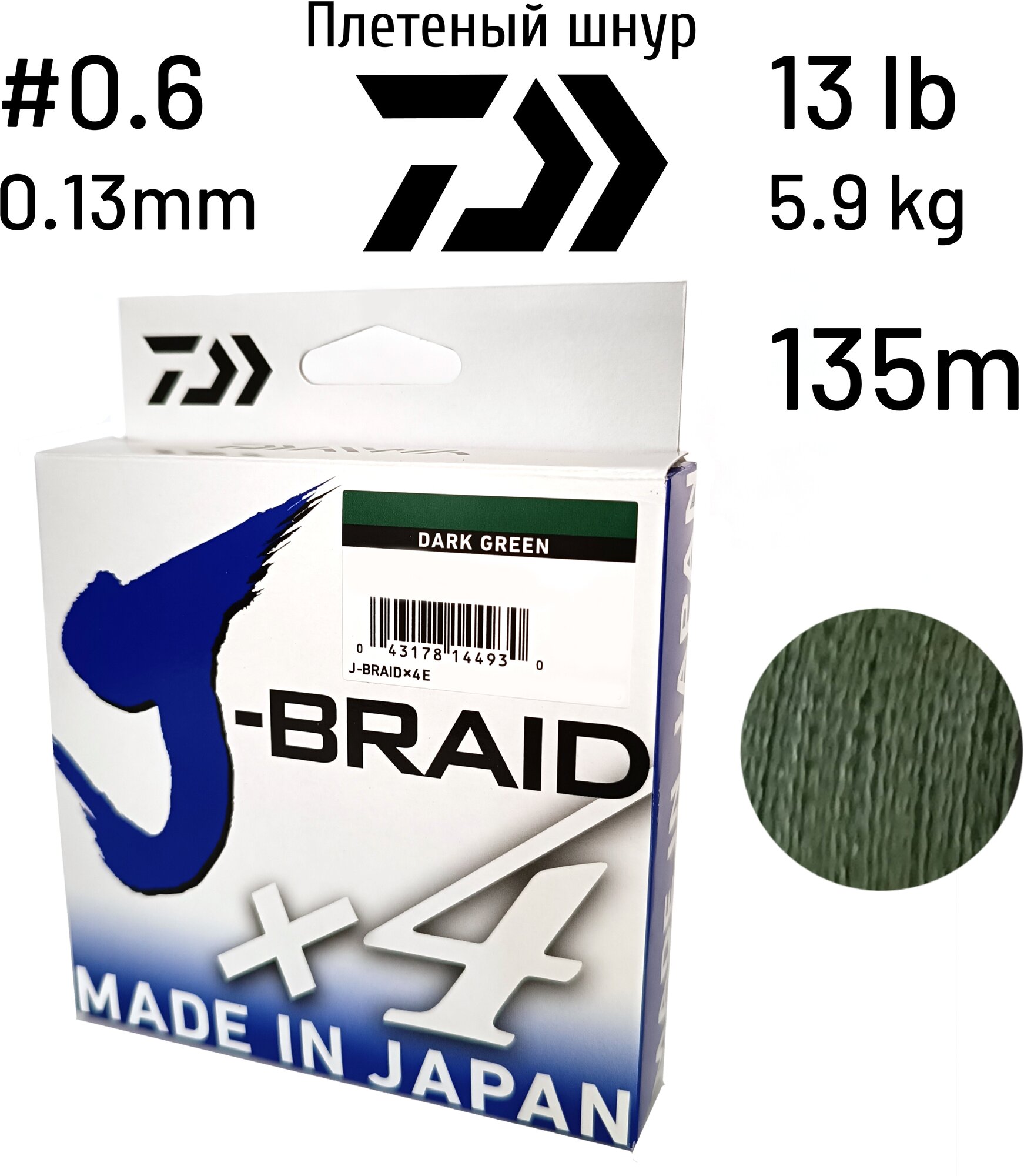 Шнур плетеный для рыбалки PE Daiwa J-BRAID X4 (0.13 мм, 5.9 кг, 135 м) цв. Тёмно-Зелёный информация: