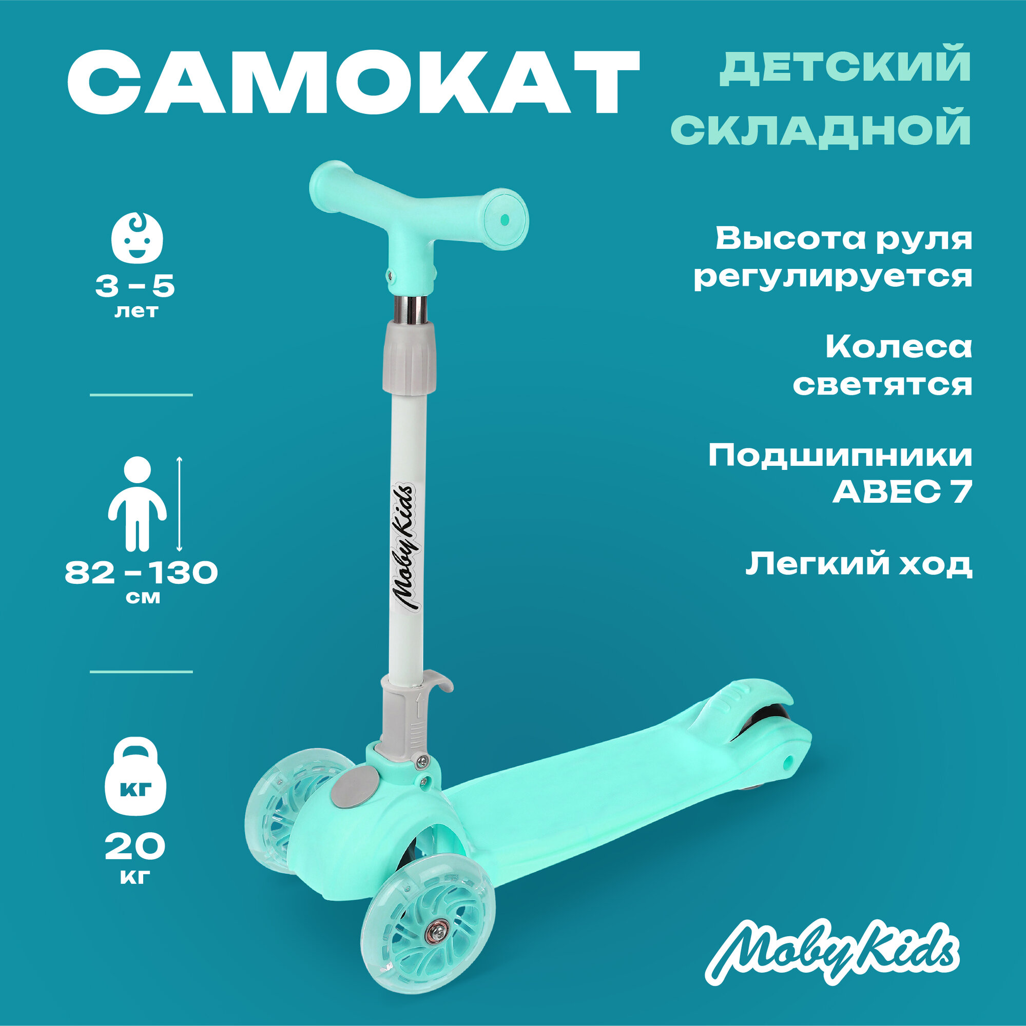 Отзывы на Самокат детский Moby Kids трехколесный, складной, колеса 120 мм, PU, со светом, мятный (641391)