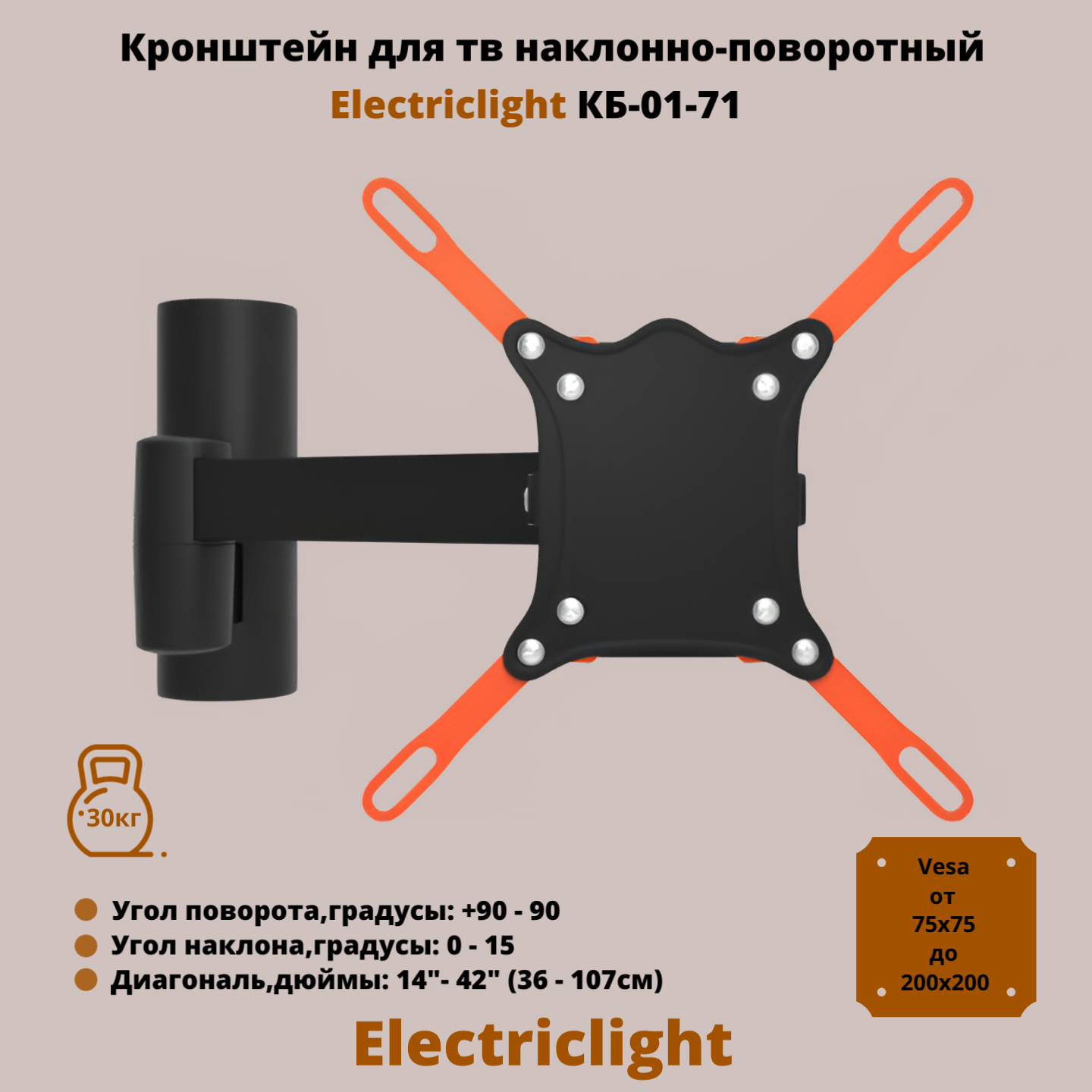 Кронштейн для телевизора Electriclight КБ-01-71 с наклоном и поворотом до 30кг 14..42 дюйма VESA до 200мм, чёрный